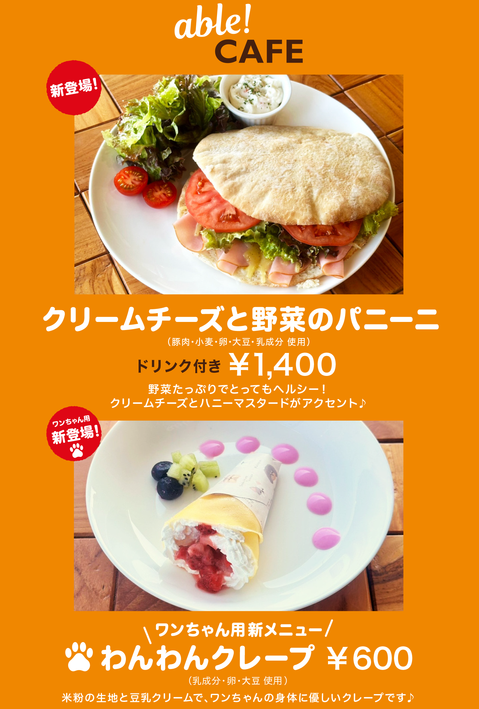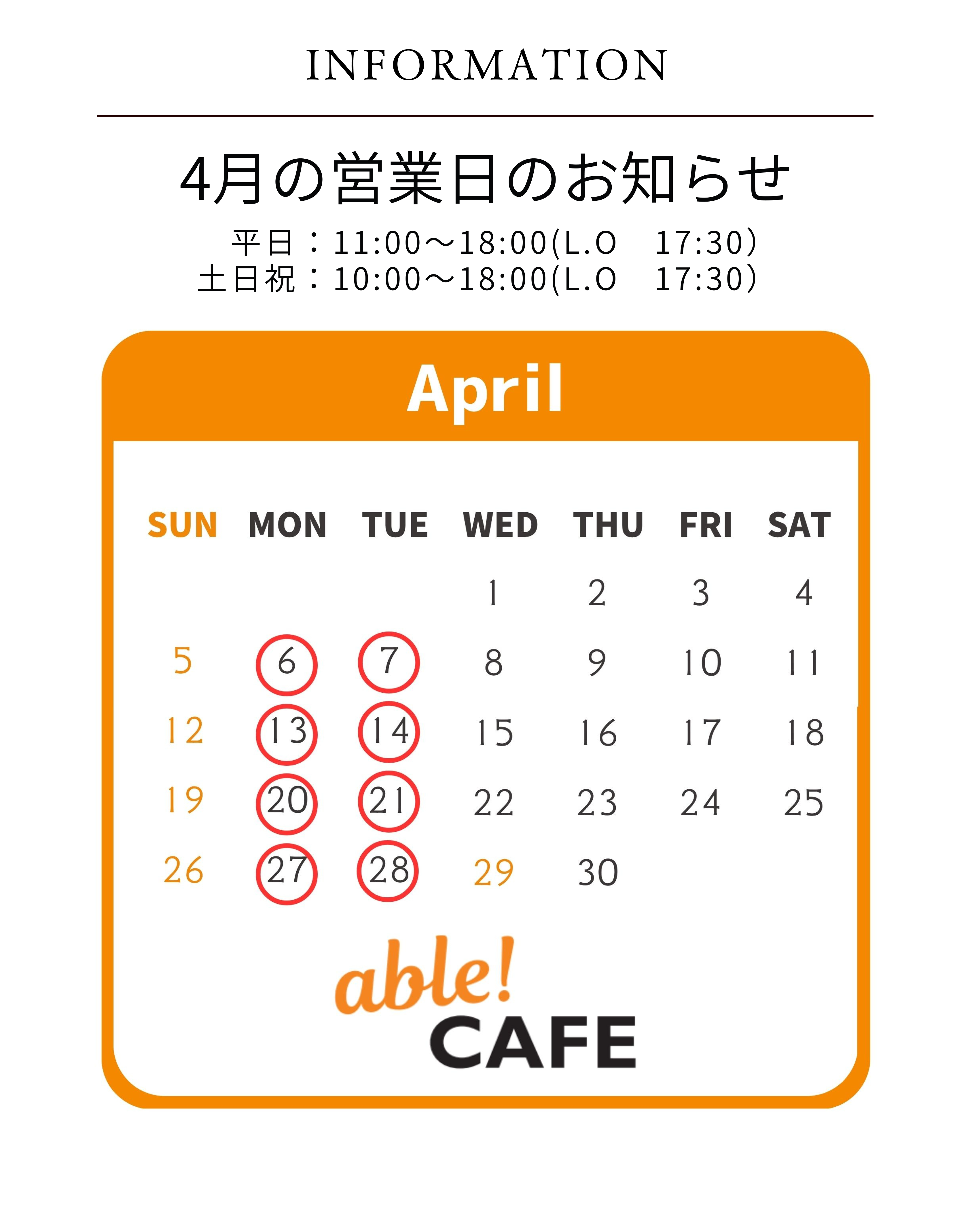 able!CAFE 新メニューと4月営業日をお知らせします。